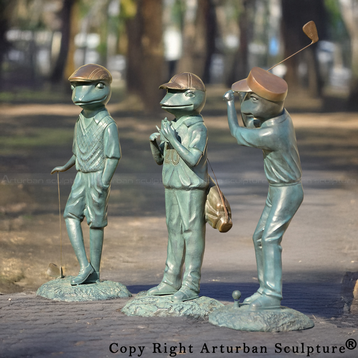 The frog Golf Statues are cast from high-quality, durable bronze, meticulously polished and treated with a patina finish. The primary color is green, with accents of bronze. The three Bronze Frog Garden Ornament sculptures can be displayed individually or combined to create a complete golf scene. They are ideal for garden lawns, villa courtyards, golf clubs, or outdoor landscapes, serving as both decorative elements and a reflection of lifestyle. Arturban Statue can customize various Whimsical Animal Statues.Welcome to contact us for more details.