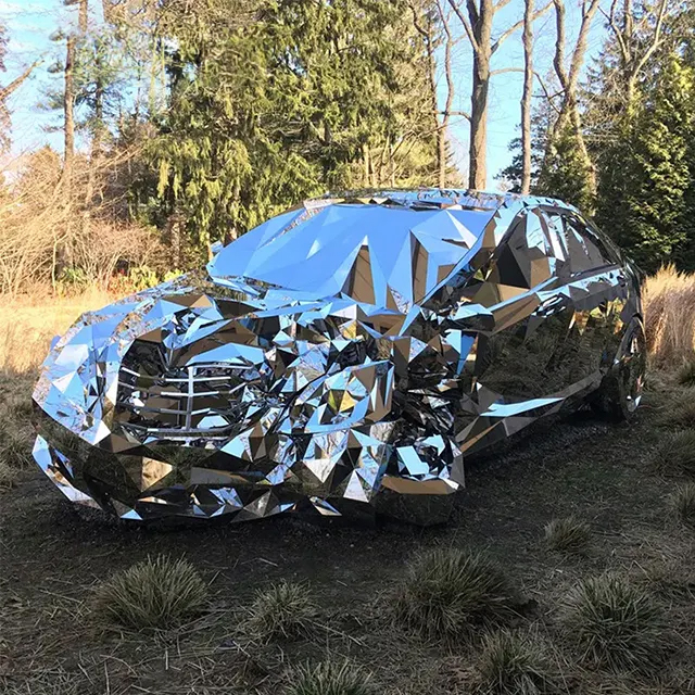 Composed of 12,000 laser-cut mirrored stainless steel panels, this stainless steel Car Crash Sculpture depicts a distorted luxury car after a crash. The car’s body is stretched, fractured, and dented. The mirrored surface not only enhances the sculpture’s futuristic quality but also reflects its surroundings. This Metal Car Sculpture is suitable for display in public spaces, contemporary art exhibitions, or cultural centers. Arturban Statue can customize various stainless steel statues. Welcome to contact us for more details.