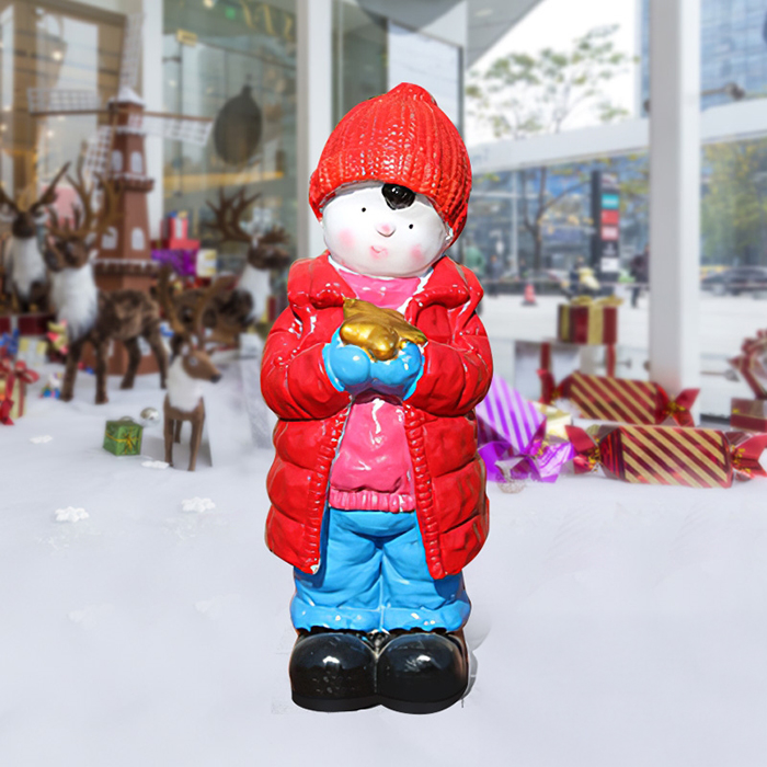 This sculpture series features festive Christmas children. Crafted from fiberglass, the vibrant colors and vivid details evoke a festive winter atmosphere. The first sculpture depicts a child wearing a red down jacket and blue pants, holding a golden gift with a warm expression. The second Christmas Kid Figurine depicts a child wearing a red cotton jacket and a blue scarf, waving a small golden bell with a cheerful expression, as if spreading the joy of Christmas through the ringing.