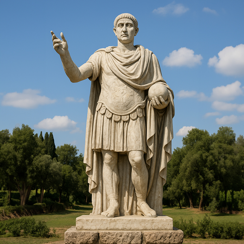 The figure has short, close-fitting hair and a serious expression. He wears Roman military attire over a long robe that drapes from his shoulders to his back and legs, with wide, layered folds on the back. His right hand is raised in a gesture; his left hand holds a spherical object. One leg bears the weight, while the other is naturally bent, resulting in a stable posture. The Constantine Marble Statue is commonly used in courtyards, public landscapes, and cultural exhibition spaces. Arturban Sculpture can customize various greek and roman sculpture. Welcome to contact us for more details.