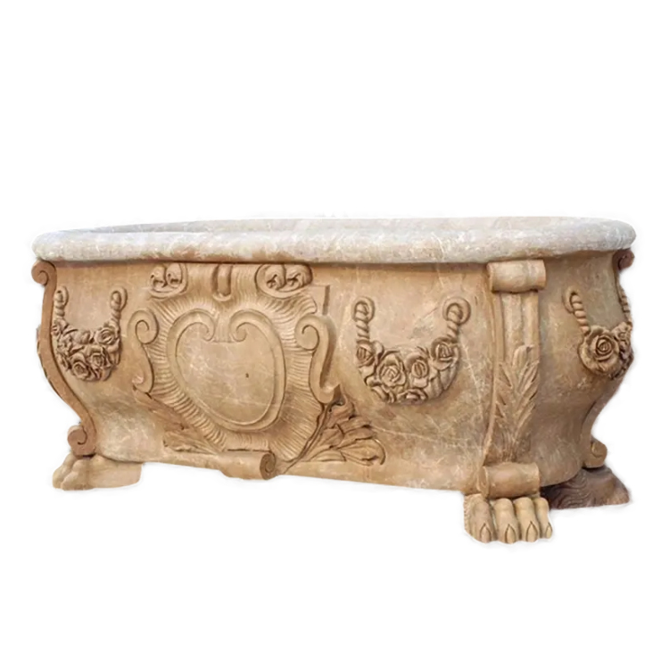 This bathtub features a classic European design, with a robust and full overall shape. The exterior of the Lion Claw Bathtub is presented in a light beige stone texture with naturally distributed patterns and rounded edges. The upper edge is noticeably thickened, with continuous and stable lines.