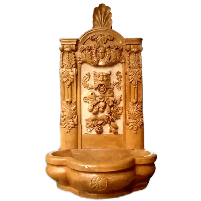 In terms of decorative elements, the relief on the back panel of this series of fountains is clearly defined and well-divided. Some styles feature a figure relief depicting a standing woman, with flowing drapes and complete proportions, surrounded by an arched frame; other styles use an animal face relief as the central decoration, paired with fruit, vine, and leaf patterns. Three-dimensional decorative elements such as grapes, wreaths, and plant foliage are visible around the relief, combined with a column-style frame, making the overall back panel more substantial.