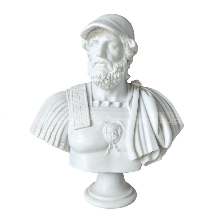 This is a marble roman male bust. Marble bust sculpture is the creation of artistic busts by carving marble. The craftsmanship of this sculpture is exquisite, and the texture of marble can bring unique texture and luster to the sculpture. The handling of character details also requires sculptors to accurately grasp and handle the characteristics and details of the figures. Marble bust sculpture is often hailed as a highly technical art form.
