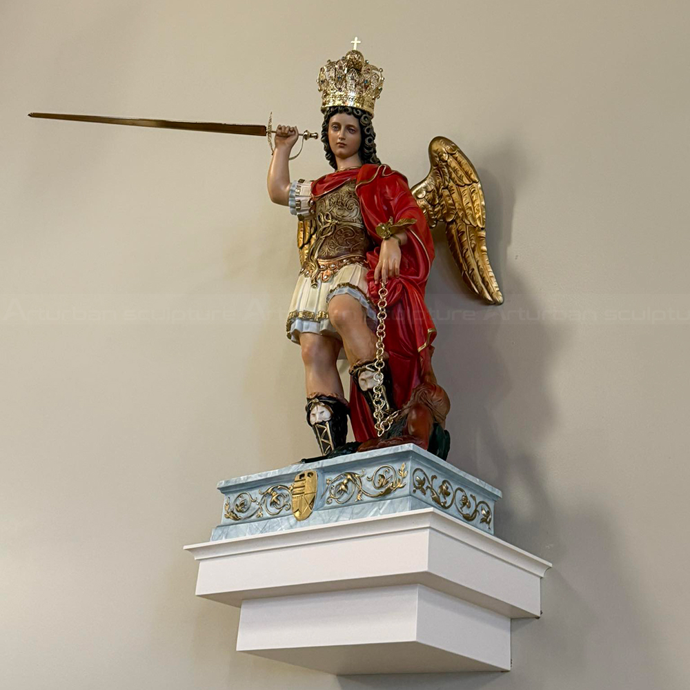 These Saint Michael Archangel Slaying Demon Statues are mostly made using fine resin or fiberglass techniques, with vibrant and richly layered paint giving the armor, cloak, and wings a bright, sacred sheen. Some works capture the moment of battle with a raised sword; others use chains to symbolize the binding of evil; and still others are wall-mounted, suitable for display in churches or altars. The bases of the statues are often carved with flames, rocks, or subdued demons, adding dramatic tension to the entire work. This group of San Miguel Arcangel Big Statues is suitable for outdoor garden displays, church decorations, religious celebrations, or as protective symbols in home spaces. Arturban Statue specialize in custom angel statues tailored to your unique vision. Feel free to contact us for more details.