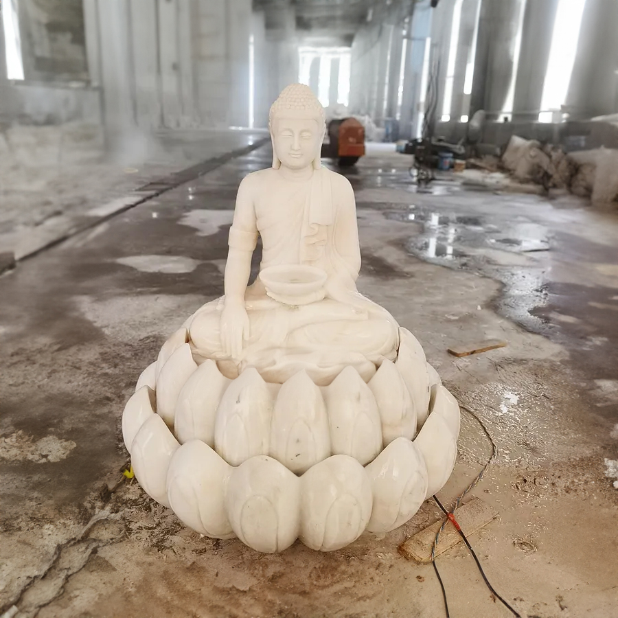 The Buddha in the Shakyamuni Buddha Statue sits cross-legged on a full lotus throne, the petals unfolding layer by layer, the form solid and stable. His left hand naturally holds the alms bowl in front of his abdomen, while his right hand is in the earth-touching mudra (gesture of touching the earth), his posture dignified and restrained. The Buddha’s facial features are soft and realistic, his eyes slightly lowered, his expression serene and focused. His hair is meticulously styled in spirals, his ushnisha (cranial protuberance) is full, and his earlobes are long. His monastic robe drapes naturally from his shoulders, the lines flowing smoothly, the folds orderly and conforming closely to his body structure. The material is pure white and warm to the touch, with a finely polished surface. This Shakyamuni Buddha Statue Tibet is suitable for placement in temple shrines, Tibetan religious spaces, meditation centers, or tranquil courtyards. Arturban Sculpture can customize various Marble Buddhism sculptures. Welcome to contact us for more details.