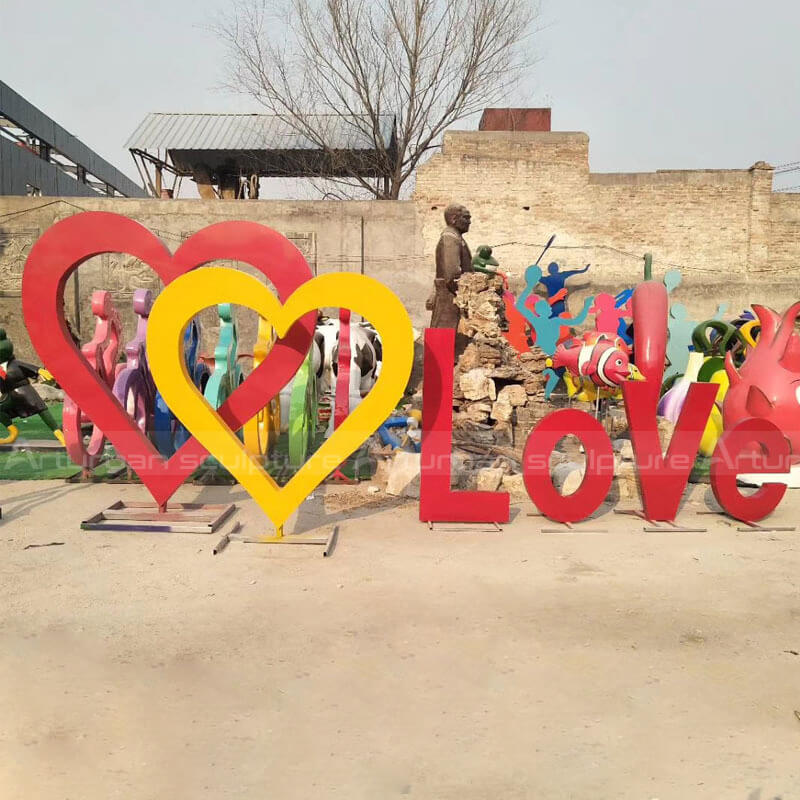 This sculpture is made of high-quality 304 stainless steel. A red heart and a yellow heart and love form a very bright and colorful image. This sculpture was carefully carved and polished by our sculptors, and finally painted with outdoor car paint. It not only has bright colors, but also can be maintained outdoors for a long time. We support custom-made stainless steel art sculptures of various sizes, which can be placed on various occasions. If you are looking for high-quality stainless steel art sculptures, want to know stainless steel letters price, you can contact us at any time for more details.