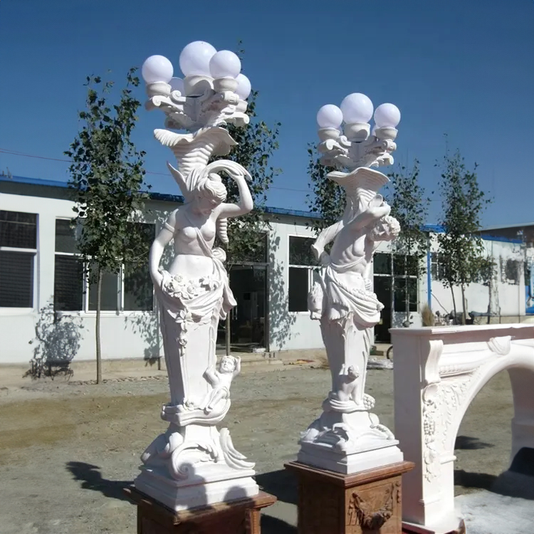 The entire White Marble Lady Lamp Outdoor is constructed of white marble with clean lines, suitable for long-term outdoor display. These female lamp sculptures are typically placed symmetrically, commonly found at villa entrances, main courtyard pathways, landscape axes, or plazas, providing ambient lighting at night while also serving as stable landscape features. Arturban Sculpture can customize various marble lamp statues. Welcome to contact us for more details.