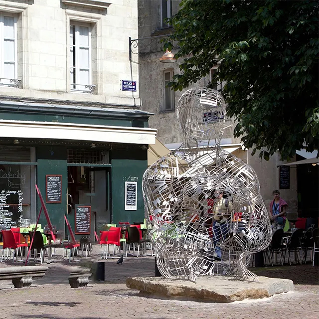 Crafted entirely from stainless steel, the sculpture’s hollow wire mesh structure depicts a seated figure, serene and restrained, as if immersed in an inner musical world. The surface of the Wire Man Sculpture is covered in musical staff and musical notation, imbuing the static form with a rhythmic and dynamic beauty. The Wire Human Figure, both solemn and poetic, is ideally suited for display in city plazas, parks, or cultural venues, creating a tranquil and profound artistic atmosphere. Arturban Statue can customize various stainless steel statues. Welcome to contact us for more details.